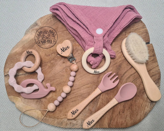 Offriamo articoli per neonati e bambini, personalizzati o meno: stoviglie in silicone, set pasto, accessori pratici, giocattoli, tessuti e regali di nascita unici.