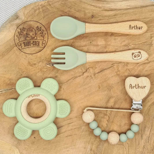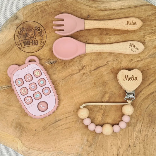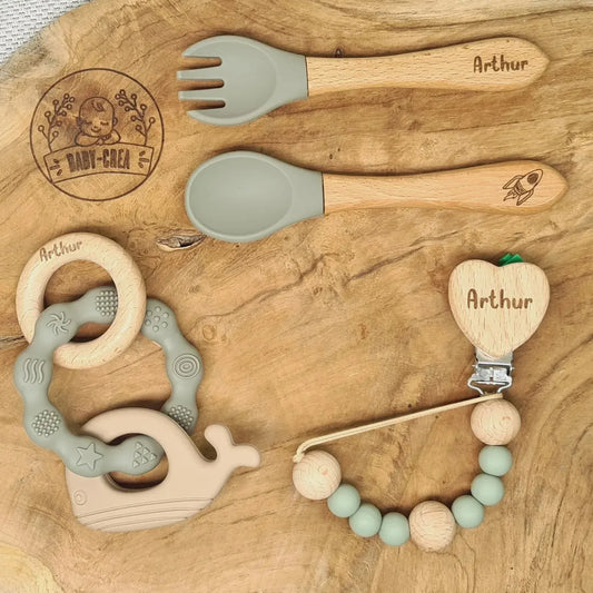 Set regalo personalizzato per neonati: posate, clip per ciuccio e anello per la dentizione a corona