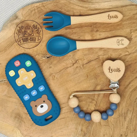 Set regalo personalizzato per neonati: posate, clip per ciuccio e giocattolo telecomandato