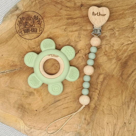 Set regalo personalizzato per neonati: clip per ciuccio e anello pop-up per la dentizione