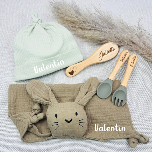 Set regalo nascita personalizzato: peluche a forma di coniglio, cappello, posate, spazzola