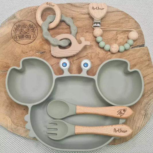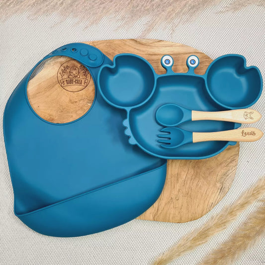 Set personalizzato per pasti per neonati: piatto a forma di granchio, posate e bavaglino