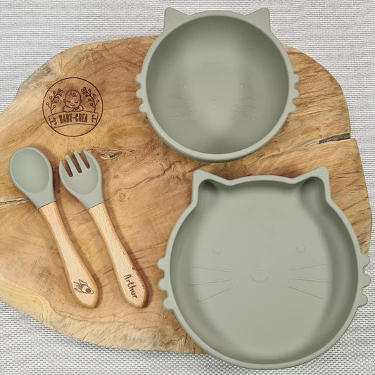 Set di pasti per bambini personalizzato: piatto, tazza e posate a forma di gatto