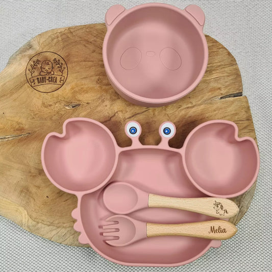 Set di pasti per bambini personalizzato: piatto a forma di granchio, ciotola a forma di panda e posate