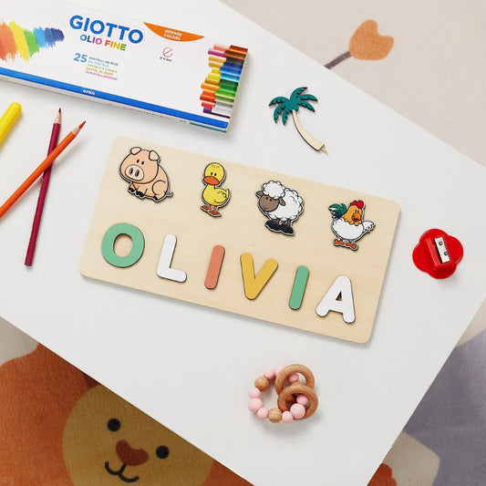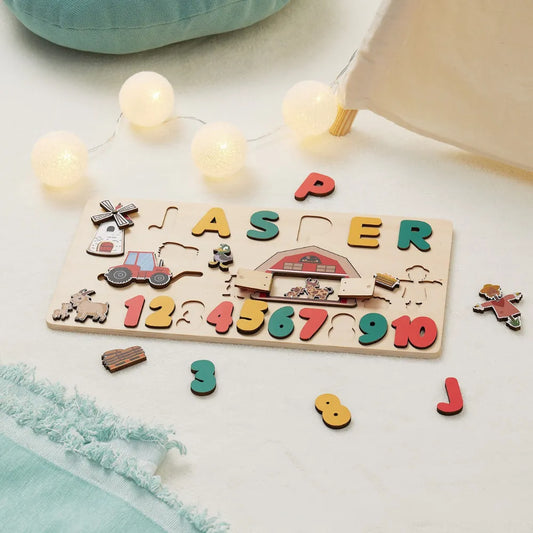 Puzzle in legno personalizzato con nome – Tema fattoria e numeri