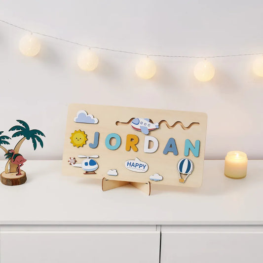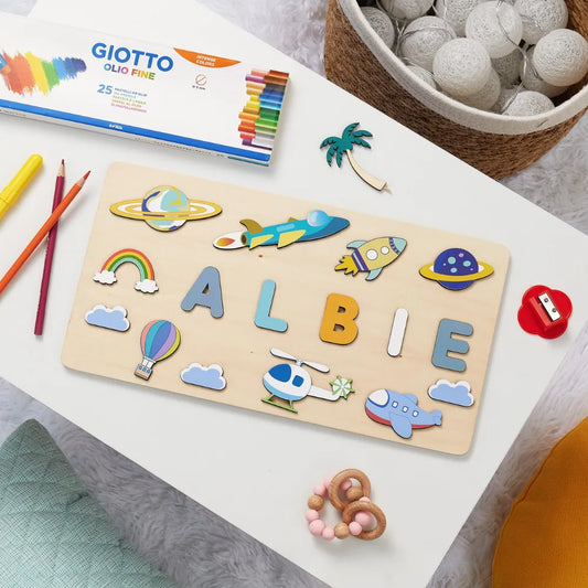 Puzzle personalizzato in legno con nome – Tema spazio e trasporti